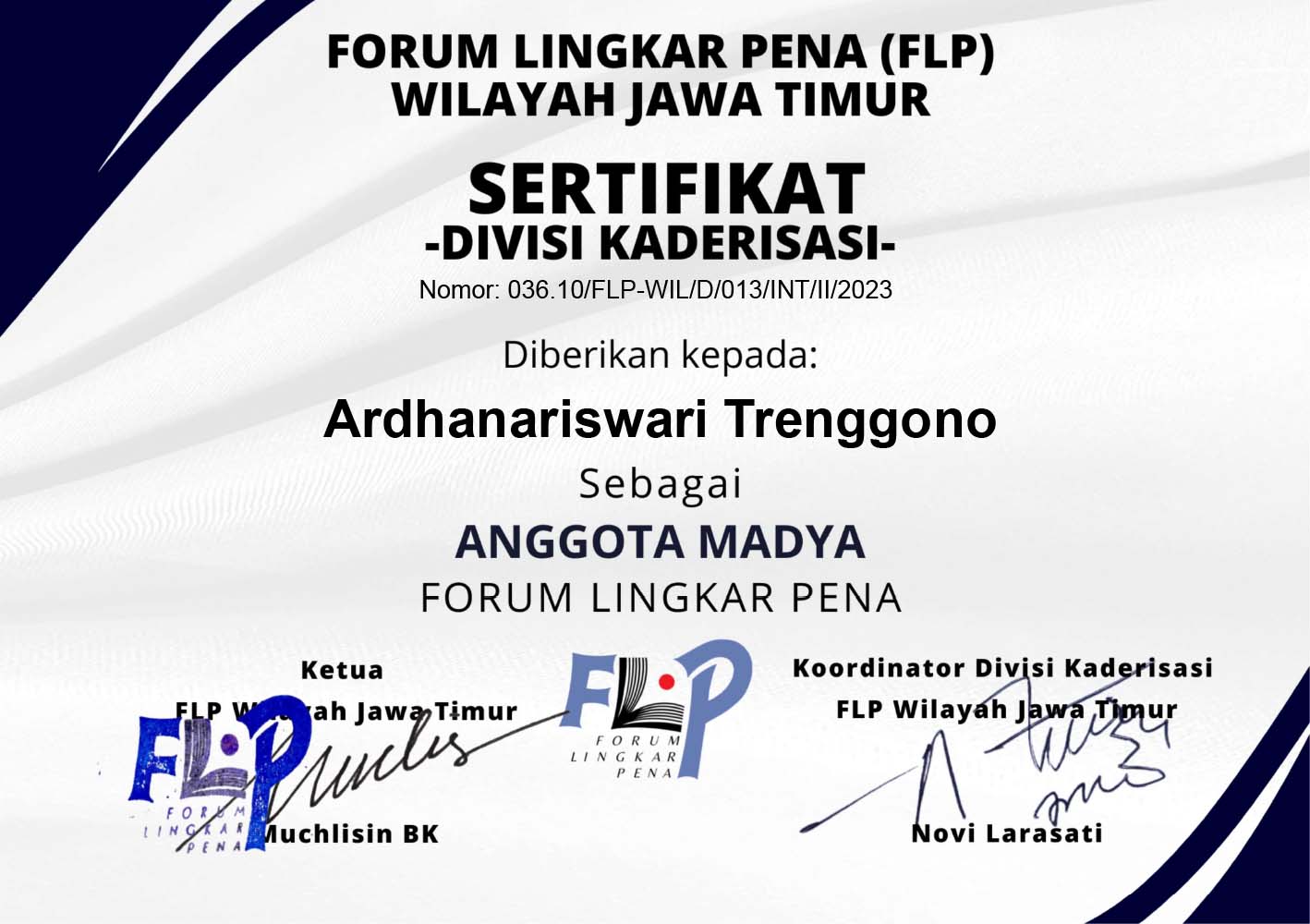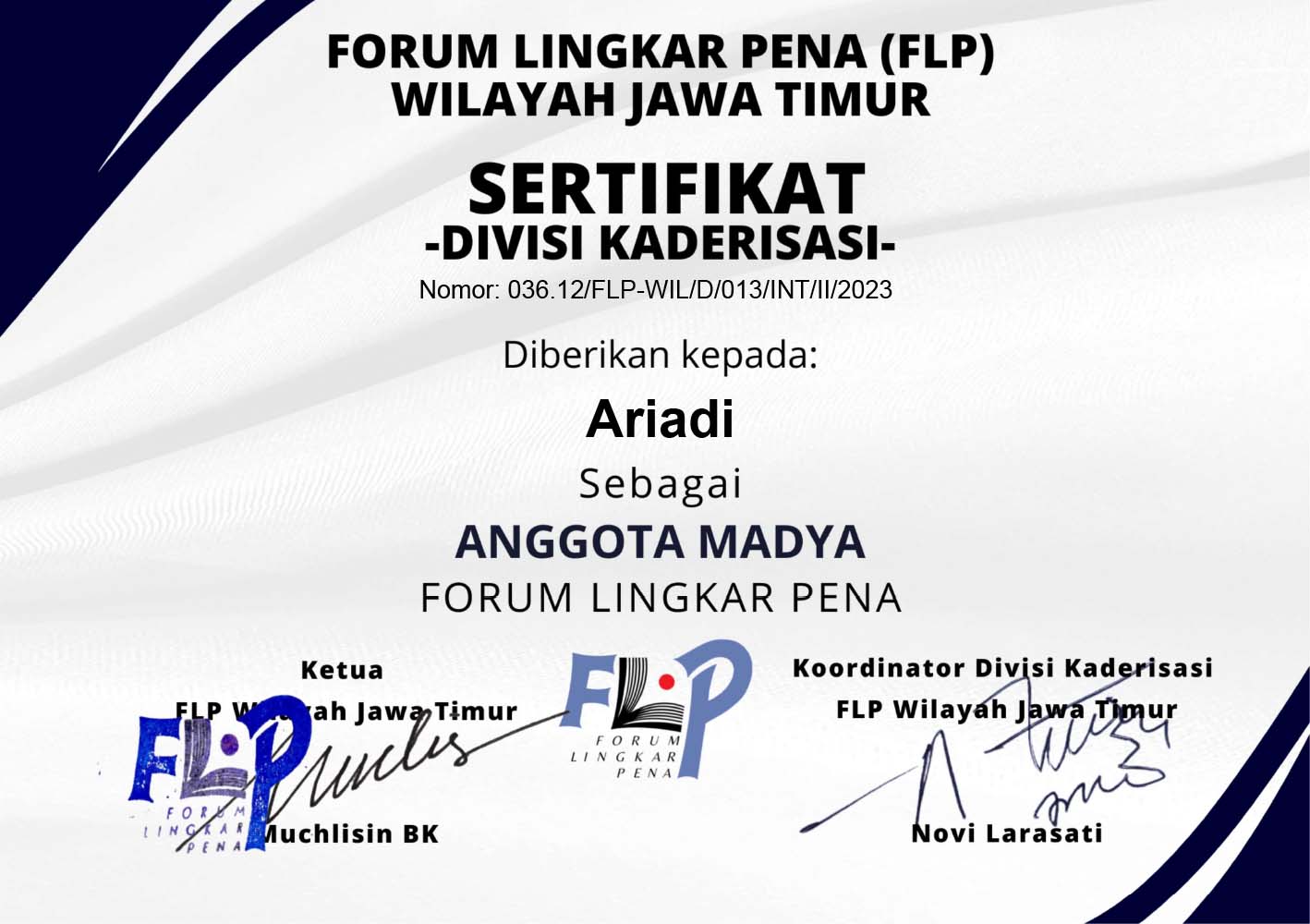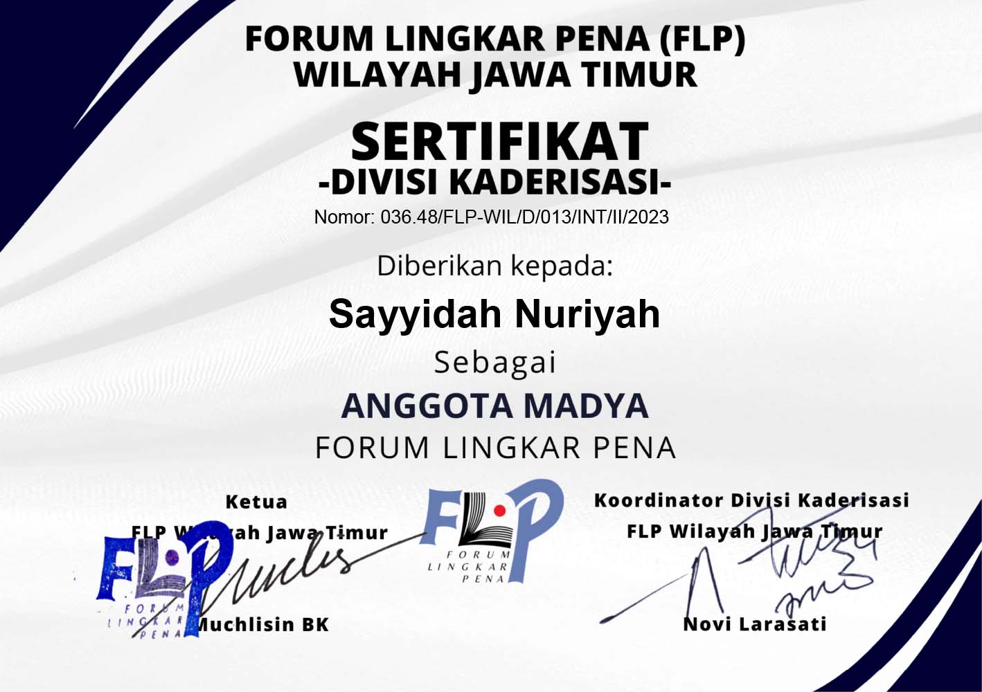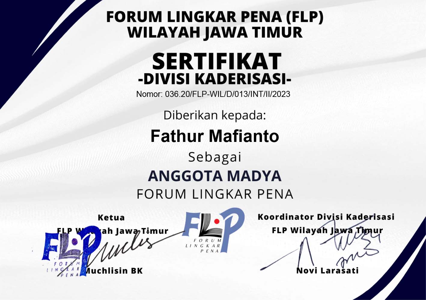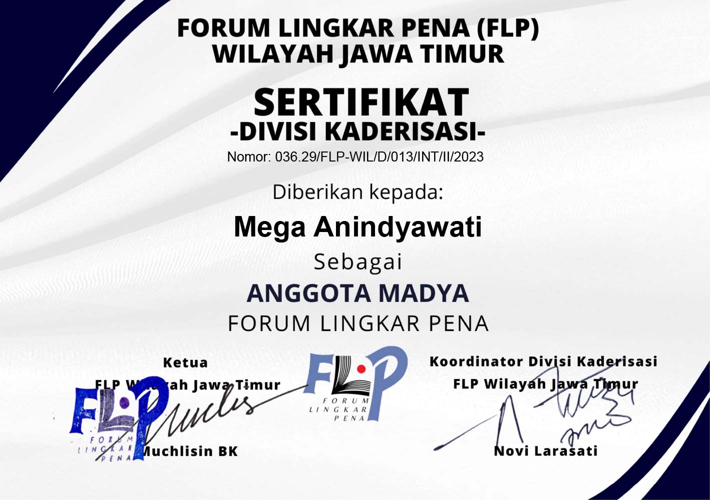 Ia juga menyampaikan bahwa sertifikat Anggota Madya bisa diunduh di flpjatim.id paling lambat mulai 8 Februari 2023. Nah, berikut ini sertifikat Anggota Madya yang bisa diunduh atau di-save as untuk keperluan yang tidak bertentangan dengan AD/ART FLP.